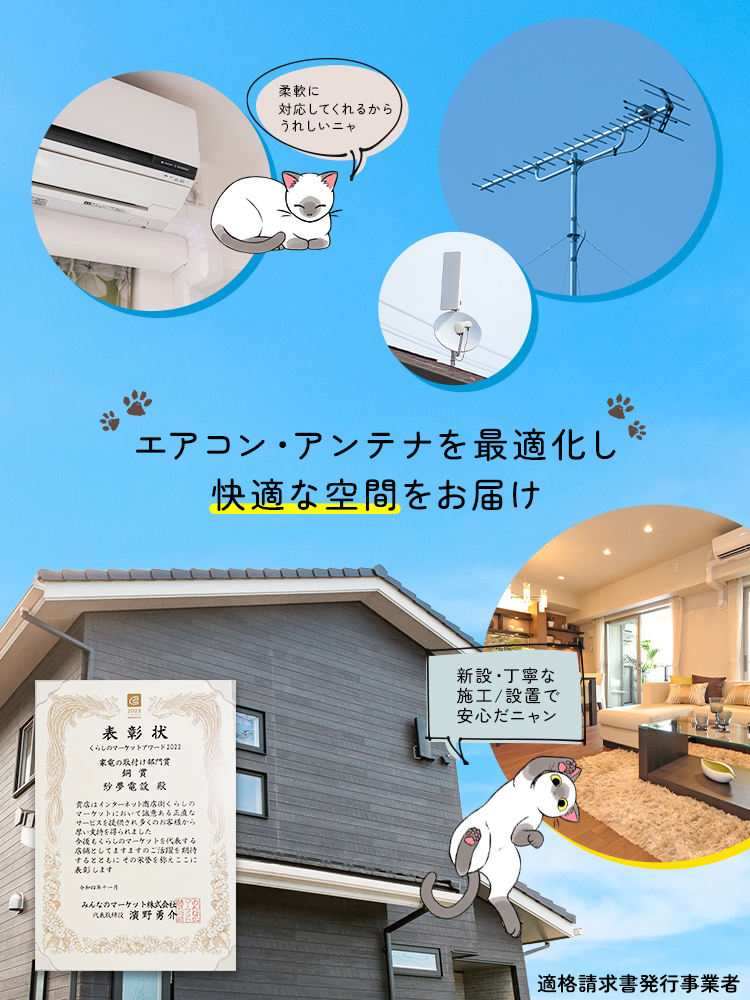 フラットに見せられるデザインアンテナや、おなじみの八木式アンテナの設置まで、アンテナに関することなら幅広く対応しております。
